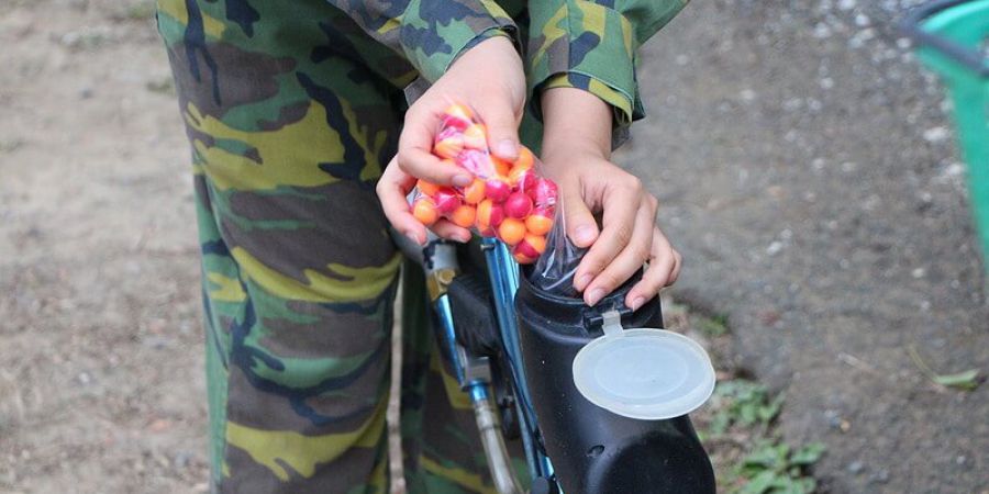 漆 彈 Paintball 當擊中目標後留下顏色,內部充填可食性甘油及水溶性色料的圓形膠囊。本場使用:Diablo Blaze/Inferno漆彈,雙色Small Bore Tournament級世界杯比賽用彈。